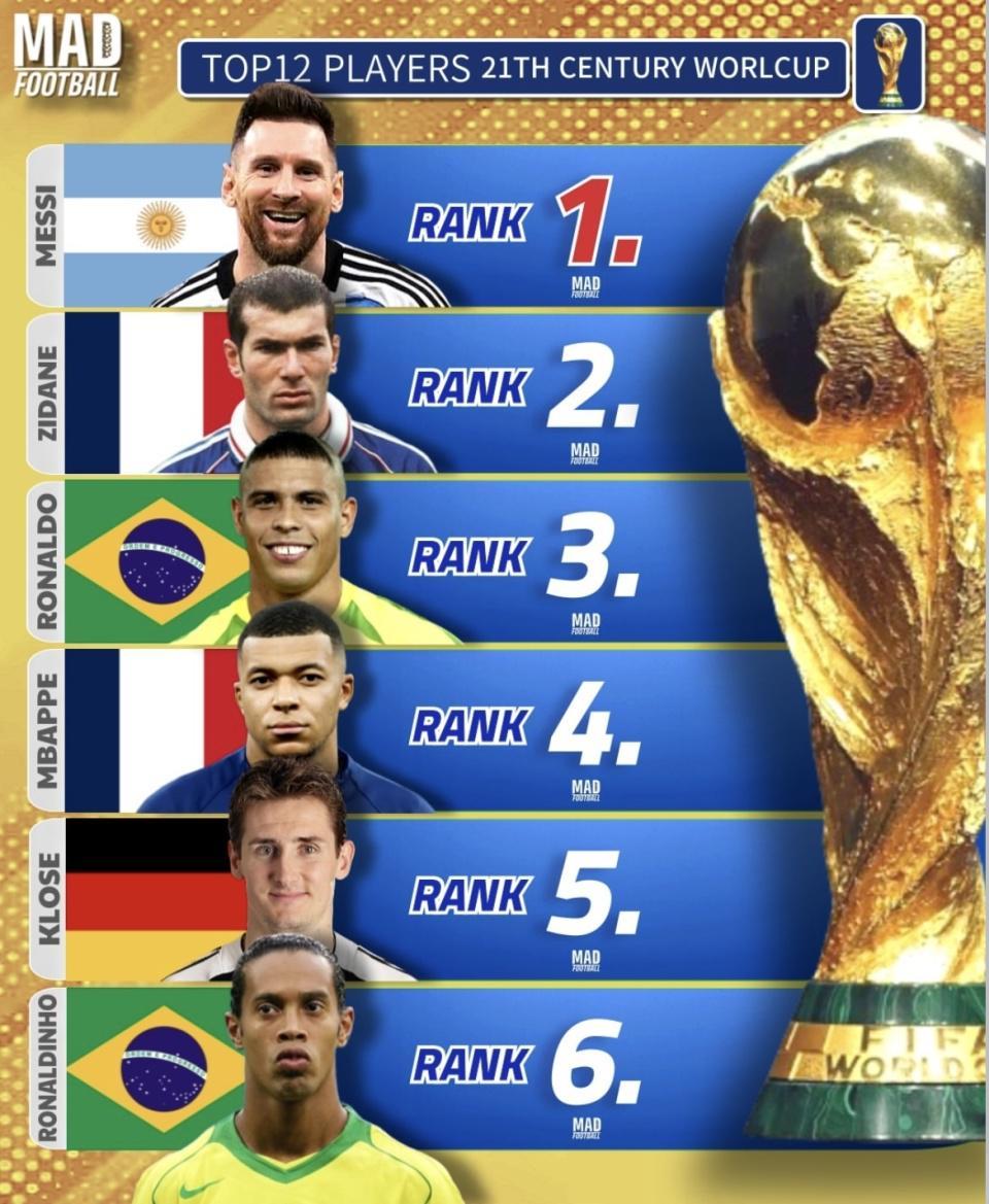 最近MAD足球整理了一份“21世纪世界杯TOP12球员”榜单,梅西排第1,齐达内、罗纳尔多、姆巴佩也都在前列。克洛泽被放到第5,亨利和C罗则落在第10、第11,这个顺序一摆出来,反差立刻就有了。更扎心的是,整份名单里几乎看不到后场位置的存在感,只有卡纳瓦罗一个人撑场。把C罗放在第11、把卡纳瓦罗放在第12,这样的排法到底算不算合理?